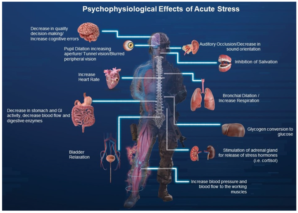The negative effects of the Acute Stress Response include a number of well researched and verified biological and neurological conditions, which dramatically lower cognitive ability, physical well being and, longevity. In real terms, ones mental well being, the ability to make effective decisions, physical health, and work performance decreases.